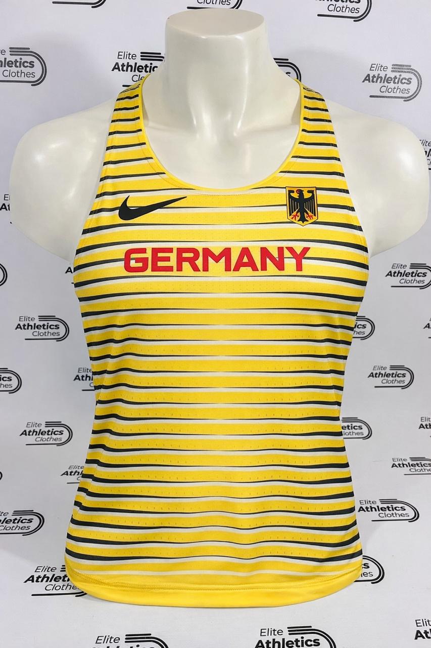 Nike Germany Pro Elite 2022 Women Distance Singlet worn by the Germany International Team pro athletes during 2022 season.
